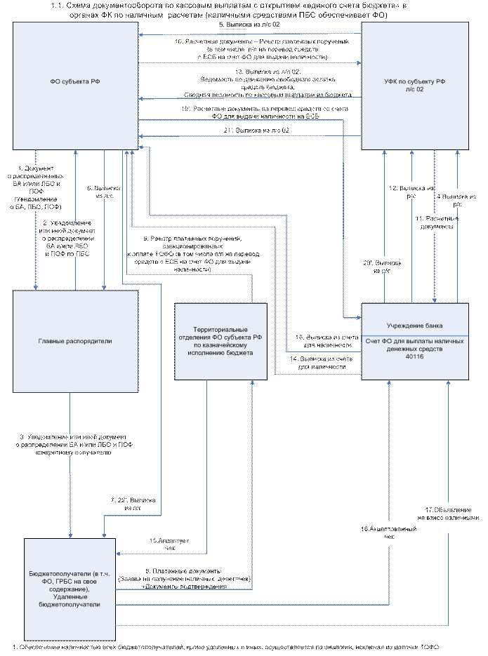 ВАРИАНТ КО 2. ВАРИАНТ КО 1.2. ВАРИАНТ КО 1.1. Операции с безналичными средствами – как описано в «ВАРИАНТ КО 1». Финансовый орган организует выдачу наличности получателям бюджетных средств со счета № 40116 «Средства для выплаты наличных денег бюджетополучателям», открытого ему в учреждении банка. Для обеспечения наличностью удаленных ПБС территориальным подразделениям ФО (ТПФО) открываются расчетные счета № 40116 «Средства для выплаты наличных денег бюджетополучателям». К счетам для выдачи наличности никакие лицевые счета не открываются. Выдача наличных денежных средств осуществляется по предъявлении получателем бюджетных средств акцептованного чека. Начиная со стрелки под номером 17 – описание процесса возврата денежных средств на счета для наличности на ЕСБ. В этом случае ПБС вносят деньги на счет для наличности по Объявлению на взнос наличными. Стрелки 1 – 3 – доведение плановых показателей. Стрелки 4 – 7 – доведение данных о поступлении средств на счета. Стрелки 8 – 11 – операции по перечислению денежных средств с ЕСБ и получению наличных получателями Стрелки 12 – 16 – доведение данных о произведенных кассовых выплатах Стрелки 17 – 22 - процесс возврата денежных средств со счета для наличности на ЕСБ. В этом случае ПБС вносят деньги на счет для наличности по Объявлению на взнос наличными.