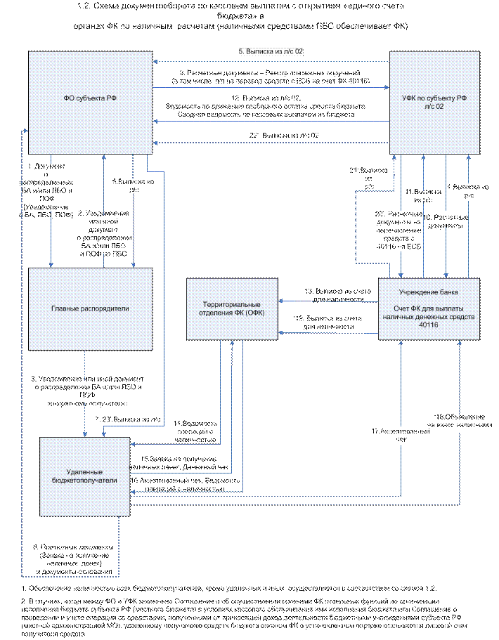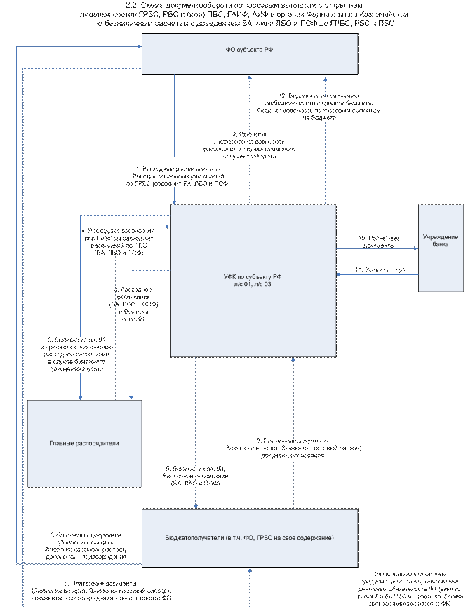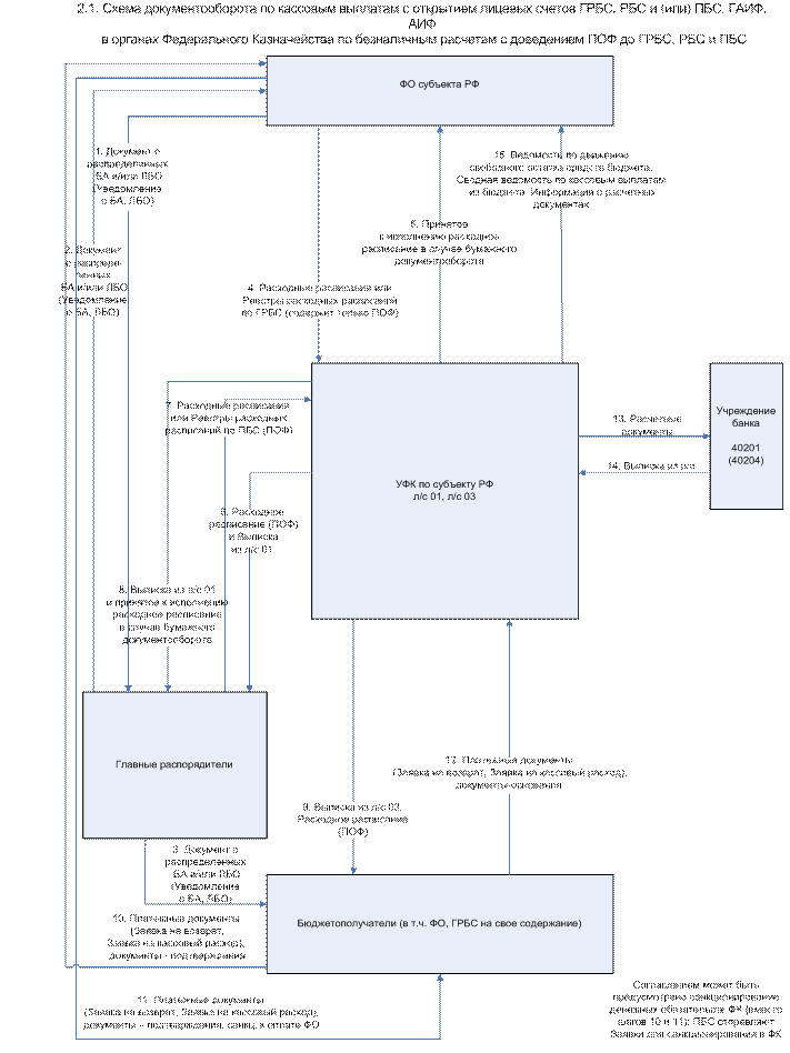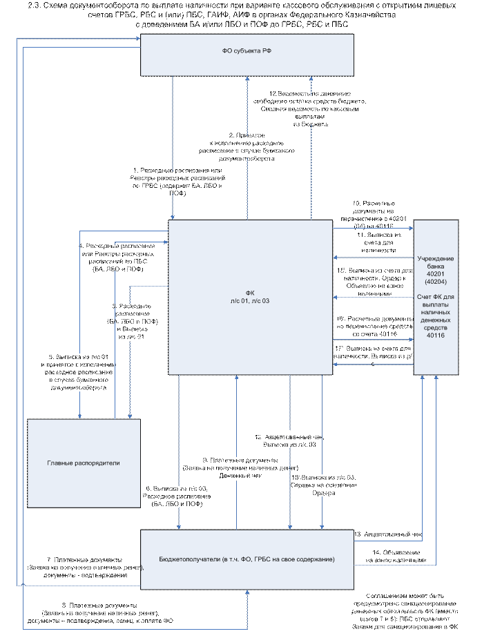 В этом случае кассовое обслуживание соответствующего бюджета может осуществляться по следующим вариантам: с доведением до ГРБС, РБС и/или ПБС органами ФК предельных объемов финансирования расходов на основании Расходных расписаний или Реестров расходных расписаний, представленных в органы ФК ФО, ГРБС, РБС (далее – вариант 2.1); с доведением до ГРБС, РБС и/или ПБС органами ФК бюджетных ассигнований и/или лимитов бюджетных обязательств и предельных объемов финансирования расходов на основании Расходных расписаний или Реестров расходных расписаний, представленных в органы ФК ФО, ГРБС, РБС (далее – вариант 2.2). бюджетных ассигнований для осуществления операций с источниками финансирования дефицита бюджета субъекта Российской Федерации (местного бюджета) на основании Расходных расписаний или Реестров расходных расписаний(вариант 2.3), представленных в органы Федерального казначейства финансовыми органами, главными распорядителями (распорядителями) средств бюджета. При варианте КО 2 1. Финансовому органу, главным распорядителям, распорядителям, получателям бюджетных средств, иным получателям, главным администраторам (администраторам источников финансирования дефицита бюджета с полномочиями главного администратора) и администраторам источников финансирования дефицита бюджета лицевые счета открываются в органах Федерального казначейства. 2. Финансовый орган представляет в орган Федерального казначейства расходные расписания или реестры расходных расписаний главных распорядителей бюджетных средств, ГАИФ в разрезе кодов бюджетной классификации РФ в пределах остатка средств к распределению, либо с его превышением в соответствии с условиями соглашения между финансовым органом и органом Федерального казначейства. 3. Главные распорядители и распорядители бюджетных средств, ГАИФ представляют в орган Федерального казначейства расходные расписания или реестры расходных расписаний подведомственных получателей бюджетных средств в разрезе кодов бюджетной классификации РФ в пределах остатка средств к распределению. 4. Получатели бюджетных средств, АИФ представляют в орган Федерального казначейства платежные документы (Заявку на кассовый расход - код формы по КФД 0531801, Заявку на получение наличных денег - код формы по КФД 0531802, Заявку на возврат - код формы по КФД 0531803) и документы-основания в пределах выделенных предельных объемов финансирования, на основании которых производятся кассовые выплаты из бюджета, предварительно проверенных. 5. Санкционирование оплаты денежных обязательств получателей бюджетных средств, АИФ в пределах остатка средств на лицевых счетах осуществляется финансовым органом, главным распорядителем (распорядителем) средств бюджета, ГАИФ либо органом Федерального казначейства, согласно Соглашению. Санкционирование целевых расходов (субсидии, субвенции, полученные из федерального бюджета, за исключением субсидий, субвенций, полученных в порядке компенсации произведенных кассовых расходов) осуществляется также органами федерального казначейства. 6. Проведение и учет операций с наличными денежными средствами осуществляется органом Федерального казначейства на счете, открытом ему в учреждении банка на балансовом счете № 40116 «Средства для выплаты наличных денег бюджетополучателям». При 