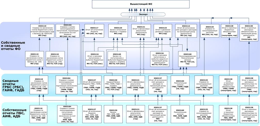 Отчетность ФО условно можно разделить на несколько типов: Собственные отчеты – отчеты, которые формируются на основании первичных данных, учитываемых непосредственно этим участником (данных из регистров учета); Сводные отчеты – отчеты, консолидируемые соответствующим участником по собственным отчетам (учетным данным) и отчетам подведомственных участников в рамках одного бюджета; Консолидированные отчеты - отчеты об исполнении консолидированного бюджета соответствующего уровня, формируемый на основании отчетности по бюджетам, входящим в состав консолидированного бюджета. Собственные отчеты обычно не предоставляются вышестоящему ФО. Информация из собственных отчетов, как правило, используется при составлении сводных отчетов. Вышестоящему ФО предоставляются только сводные и консолидированные (в случае если ФО их формирует) отчеты. Схематично процесс формирования отчетов собственных и сводных отчетов ФО можно представить следующим образом (см. рисунок). Из рисунка видно, что собственными отчетами ФО являются формы 0503140, 0503110 к Балансу ф. 140, 0503124, 0503134. Эти отчеты участвуют в формировании сводных форм отчетности, не представляются вышестоящему ФО.