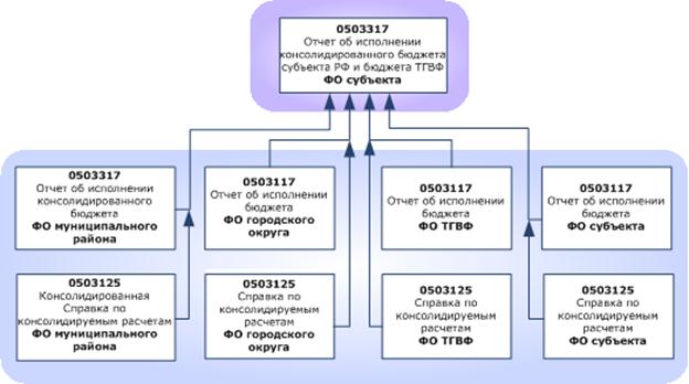 Бюджетная отчетность финансового органа, уполномоченного на формирование бюджетной отчетности об исполнении соответствующего консолидированного бюджета Российской Федерации Отчет об исполнении консолидированного бюджета составляется на следующих уровнях: - отчетность по консолидированному бюджету муниципального района (составляет ФО муниципального района); - отчетность по консолидированному бюджету субъекта (составляет ФО субъекта); - отчетность по консолидированному бюджету РФ (составляет ФК). Источником данных для отчета служат отчетные данные по текущему бюджету и отчеты ФО бюджетов, входящих в состав консолидированного. В консолидированные отчеты субъекта включаются данные по территориальному внебюджетному фонду обязательного медицинского страхования (они отражаются в отдельной колонке). Предположим, что в состав субъекта входит один городской округ, один муниципальный район, кроме того на уровне субъекта есть территориальный внебюджетный фонд обязательного медицинского страхования (ТГВФ), тогда формирование отчета об исполнении консолидированного бюджета субъекта РФ и бюджета ТГВФ (ф.0503317) будет производиться из следующих источников: