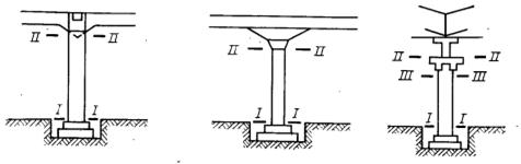 Рисунок 15 – Расположение рабочих швов при бетонировании колонн I-I – III-III – места возможных рабочих швов ¾ в балочных плитах – в любом месте, поперек балок; ¾ в плитах, опертых по контуру – в обоих направлениях, но в переделах 1/3 пролета плиты. При возобновлении бетонирования счищают цементную пленку, поверхность промывают водой и покрывают тонким слоем свежего цемента. Снимать боковые элементы опалубки не несущие нагрузок можно после достижения прочности обеспечивающей сохранность углов, кромок и поверхностей. Несущие элементы опалубки снимают после достижения бетоном прочности, обеспечивающей сохранность конструкций: ¾ для плит пролетом до 3-х метров и несущих конструкций пролетом до 6м – 70% прочности (9+3-4суток); ¾ для конструкций более 6м и конструкций с напрягаемой арматурой – 80% прочности.