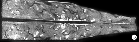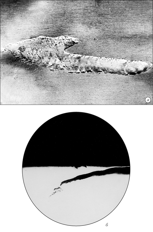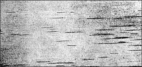 Рис. 12.5. Волосовины на поверхности листа, выявленные травлением, сталь; внешний вид×20. Волосовины в деформированном металле являются следствием нарушений технологии выплавки и разливки металла (разливка металла с повышенной загрязненностью и газонасыщенностью) и технологии температурно-деформационной обработки слитка. К способам предупреждения образования волосовин относятся: - строгое соблюдение технологии раскисления и модифицирования; - соблюдение технологии охлаждения слитка; - защита струи и зеркала металла от насыщения газом при разливке; - соблюдение технологии нагрева и температурно-деформационных параметров прокатки и охлаждения деформированного металла. Поверхностные волосовины могут быть устранены механической строжкой (фрезерованием) и зашлифовкой. Внутренние волосовины не устраняются, при этом металл бракуется. Дефект снижает механические свойства металла. 12.3. Скворечник Скворечник - дефект в виде ромбического разрыва металла с широким раскрытием (рис. 12.6). Имеет сглаженные и окисленные стенки, выходящие на боковую поверх-ность проката и прессованных полуфабрикатов. На макрошлифах и в изломах скворечник имеет вид несплошности (свища) в металле. В месте дефекта наблюдается повышенное окисление, а в сталях - обезуглероживание поверхностного слоя металла.