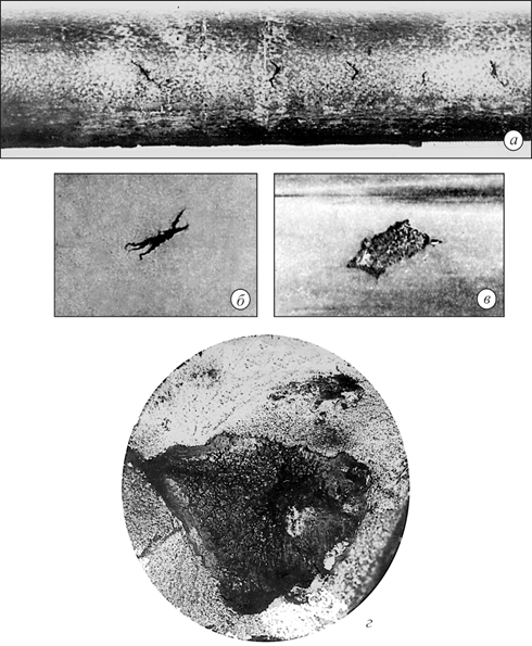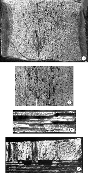 Рис. 12.6. Скворечники: а – на поверхности прутка, алюминиевый сплав; б, в – в продольном сечении проката, сталь, темплет; г – в виде треугольной воронки, прокат, сталь, излом. Дефект резко снижает все механические свойства металла в направлении, перпендикулярном оси дефекта. Дефект выявляется визуально. Дефект возникает вследствие раскрытия внутренних трещин (надрывов) в металле при его горячей деформации. Появлению скворечников способствует недостаточный нагрев слитков, снижающий пластичность центральных слоев металла при горячей деформации. Наиболее склонны к образованию скворечников высоколегированные стали и сплавы. Для предупреждения образования дефекта необходимы: -соблюдение технологии раскисления и модифицирования, технологии разливки и кристаллизации металла; -обеспечение равномерного и достаточного прогрева слитков перед горячей деформацией; -повышение качества металла слитков с целью предотвращения возникновения внутренних надрывов: -создание однородной структуры слитков; -повышение чистоты металла по неметаллическим и интерметаллидным включениям, которые могут служить очагами зарождения разрушения. Дефект не исправляется. Единичные скворечники вырезаются при раскрое проката. Дефект резко снижает все механические свойства металла в направлении, перпендикулярном оси дефекта. 12.4. Надрывы Надрывы - многочисленные, периодически повторяющиеся внутренние разрывы с широким раскрытием в металле, расположенные поперек направления деформирования (рис. 12.7).