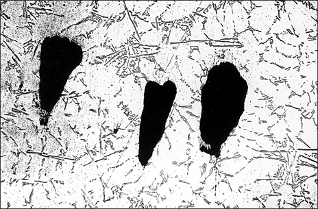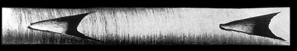 Рис. 12.7. Надрывы в продольном сечении прутка, алюминиевый сплав, темплет.