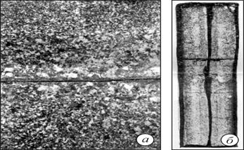 Холодные трещины (ХТ) – разрывы в металле, идущие, как правило, от головной или донной частей слитка внутрь металла, часто перпендикулярно к поверхности с незначительным разветвлением. Поверхности трещин не окислены, гладкие, блестящие. Дефект достаточно хорошо выявляется на макрошлифах и изломах. Образованию ХТ способствует неравномерное охлаждение слитка, приводящее к росту внутренних напряжений и к разрушению металла в твердом состоянии. Холодные (деформационные) трещины образуются вследствие: - повышенных степенях обжатия при прокатке; - отклонении температур деформации от оптимальных, заданных НТД; - наличии внутренних концентраторов напряжений в виде неметаллических включений, рыхлот, плен, оксидов и т.д.; - неравномерного прогрева заготовки из-за высокой скорости нагрева, вызывающей внутренние напряжения между горячими и холодными зонами металла; - неполного прогрева заготовки по сечению, вызывающий в процессе деформации возникновение «холодных» участков металла во внутренних зонах, имеющих пониженную пластичность; - концентрации напряжений на границах раздела между зонами с крупно- и мелкокристаллической структурой. Образованию холодных (деформационных) трещин способствует пониженная пластичность металла при температурах деформации. Для недопущения образования холодных трещин необходимы: - повышение пластичности металла путем повышения чистоты литого металла; - повышение структурной однородности металла; - снижение уровня остаточных напряжений; - проведение гомогенизирующего отжига; - выбор оптимальных температурно-временных параметров деформации. В готовой металлопродукции дефект не исправляется. Закрытые холодные трещины в промежуточных заготовках, обнаруженные неразрушающими методами контроля, могут быть частично или полностью заварены в процессе дальнейшей деформации при оптимальных термодеформационных режимах. Закрытые горячие трещины не устраняются. Открытые неглубокие трещины устраняются шлифовкой, строжкой или огневой зачисткой и, при необходимости, завариваются. Дефект резко снижает все механические свойства в направлении, перпендикулярном плоскости трещины. В отдельных случаях он вызывает полное разрушение детали или заготовки. 12.2 Волосовины Волосовины - дефекты в виде волосовидных нитевидных несплошностей в металле, расположенных вдоль направления деформации и наблюдаемых в форме прерывистых или сплошных нитевидных поверхностных трещин (рис. 12.5). Внутренние волосовины выявляются методами неразрушающего контроля или на макрошлифах. Контроль на наличие внутренних волосовин может осуществляться с применением ступенчатой строжки, после которой они наблюдаются визуально. Контроль поверхностных волосовин проводится люминесцентным методом и методом красок.
