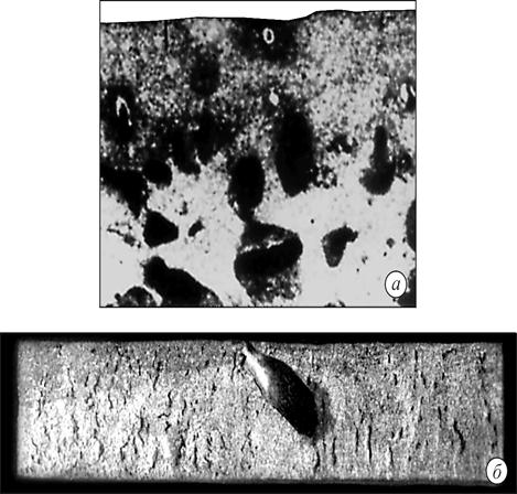 Рис. 12.11. Закаты: а – выкрошившийся закат, алюминиевый сплав, поверхность листа; б – продольное сечение плиты, алюминиевый сплав, макроструктура. 12.7. Газовая раковина · Газовая раковина - это полость, имеющая округлую или вытянутую форму со сгла-женной поверхностью, расположенная в теле слитка или отливки (закрытая раковина) или выходящая на поверхность (открытая раковина) (рис. 12.12). Открытая газовая раковина имеет темную окисленную поверхность, закрытая – может иметь как темную окисленную, так и светлую неокисленную поверхность. · Газы, выделяющиеся из металла при его затвердевании, образуют открытую или закрытую газовые раковины. Газы, внедрившиеся в металл извне, - открытую газовую раковину. В отливках газовая раковина преимущественно образуется в массивных частях. · Дефект выявляется визуально на изломах или макротемплетах и методами неразру-шающего контроля. · Газовые раковины образуются вследствие: повышенного содержания газов в металле за счет влажных шихтовых материалов, повышенной влажности дутья и топлива, нарушения режимов кипения и рафинирования расплава, недостаточного раскисления стали и сплавов, отсутствия защиты металла при выпуске и разливке, реакций газообразования при затвердевании металла в слитках и отливках. · Предупреждению образования газовых раковин в слитках и отливках способствуют меры, направленные на уменьшение газонасыщенности жидкого металла: · просушка и прокаливание шихтовых материалов, модификаторов, раскислителей, изложницы, формы, ковша; · применение сухого дутья и обезвоженного топлива; · раскисление и модифицирование металла в зависимости от способа выплавки и химического состава; · соблюдение температурно-временных параметров выплавки и разливки расплава, зависящих от химического состава металла, методов выплавки и разливки; рациональный выбор параметров и конструкции прибылей и литниково-питательных систем, в том числе: · подбор геометрических и теплофизических параметров прибыли; · подбор геометрических параметров литниковых систем при сифонной разливке слитков; · выбор режима наполнения металлом тела прибыли слитка (отливки) в заданном гидравлическом режиме, характеризующемся временем заполнения различных частей слитка (отливки) и температурой жидкого металла; · тщательная подготовка и сушка форм, изложниц, прибылей и литниковых систем (обмазка, просушка, чистка и т. д.) · Закрытые газовые раковины с неокисленной поверхностью стенок могут завариваться при горячей деформации слитка. Закрытые газовые раковины в отливках (слитках) не устраняются. Открытые газовые раковины, а также газовые раковины, вскрытые в результате обрезки прибылей или зачистки поверхности слитка, устраняются заваркой. · В слитках закрытые газовые раковины с окисленной поверхностью стенок могут быть причиной образования расслоений в деформированном металле и снижать механические свойства. Закрытые газовые раковины в отливках могут приводить к образованию трещин различного типа и к снижению эксплуатационных свойств изделий.