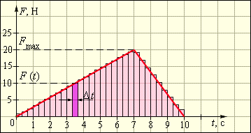 Выберем на оси времени малый интервал Δ t, в течение которого сила F (t) остается практически неизменной. Импульс силы F (t) Δ t за время Δ t будет равен площади заштрихованного столбика. Если всю ось времени на интервале от 0 до t разбить на малые интервалы Δ ti, а затем просуммировать импульсы силы на всех интервалах Δ ti, то суммарный импульс силы окажется равным площади, которую образует ступенчатая кривая с осью времени. В пределе (Δ ti → 0) эта площадь равна площади, ограниченной графиком F (t) и осью t. Этот метод определения импульса силы по графику F (t) является общим и применим для любых законов изменения силы со временем. Математически задача сводится к интегрированию функции F (t) на интервале [0; t ]. Импульс силы, график которой представлен на рис. 1.16.1, на интервале от t 1 = 0 с до t 2 = 10 сравен: