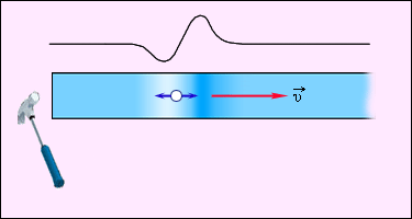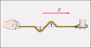 Если в каком-нибудь месте твердой, жидкой или газообразной среды возбуждены колебания частиц, то вследствие взаимодействия атомов и молекул среды колебания начинают передаваться от одной точки к другой с конечной скоростью. Процесс распространения колебаний в среде называется волной. Механические волны бывают разных видов. Если в волне частицы среды испытывают смещение в направлении, перпендикулярном направлению распространения, то волна называется поперечной. Примером волны такого рода могут служить волны, бегущие по натянутому резиновому жгуту (рис. 2.6.1) или по струне. Если смещение частиц среды происходит в направлении распространения волны, то волна называется продольной. Волны в упругом стержне (рис. 2.6.2) или звуковые волны в газе являются примерами таких волн. Волны на поверхности жидкости имеют как поперечную, так и продольную компоненты. Как в поперечных, так и в продольных волнах переноса вещества в направлении распространения волны не происходит. В процессе распространения частицы среды лишь совершают колебания около положений равновесия. Однако волны переносят энергию колебаний от одной точки среды к другой.
