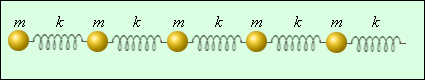 Характерной особенностью механических волн является то, что они распространяются в материальных средах (твердых, жидких или газообразных). Существуют волны, которые способны распространяться и в пустоте (например, световые волны). Для механических волн обязательно нужна среда, обладающая способностью запасать кинетическую и потенциальную энергию. Следовательно, среда должна обладать инертными и упругими свойствами. В реальных средах эти свойства распределены по всему объему. Так, например, любой малый элемент твердого тела обладает массой и упругостью. В простейшей одномерной модели твердое тело можно представить как совокупность шариков и пружинок (рис. 2.6.3).