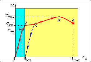 При малых деформациях (обычно существенно меньших 1 %) связь между σ и ε оказывается линейной (участок Oa на диаграмме). При этом при снятии напряжения деформация исчезает. Такая деформация называется упругой. Максимальное значение σ = σпр, при котором сохраняется линейная связь между σ и ε, называется пределом пропорциональности (точка a). На линейном участке выполняется закон Гука: