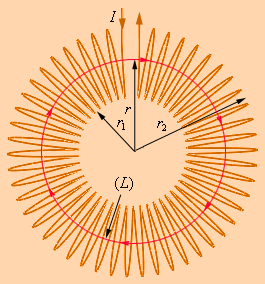 Предполагается, что катушка плотно, то есть виток к витку, намотана на немагнитный тороидальный сердечник. В такой катушке линии магнитной индукции замыкаются внутри катушки и представляют собой концентрические окружности. Они направлены так, что глядя вдоль них, мы увидели бы ток в витках, циркулирующим по часовой стрелке. Одна из линий индукции некоторого радиуса r 1 ≤ r < r 2 изображена на рис. 1.17.3. Применим теорему о циркуляции к контуру L в виде окружности, совпадающей с изображенной на рис. 1.17.3 линией индукции магнитного поля. Из соображений симметрии ясно, что модуль вектора