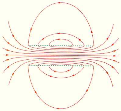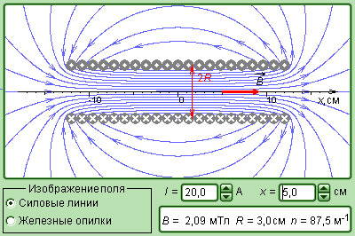 В это выражение не входит радиус тора, поэтому оно справедливо и в предельном случае r → ∞. Но в пределе каждую часть тороидальной катушки можно рассматривать как длинную прямолинейную катушку. Такие катушки называют соленоидами. Вдали от торцов соленоида модуль магнитной индукции выражается тем же соотношением, что и в случае тороидальной катушки. На рис. 1.17.4 изображено магнитное поле катушки конечной длины. Следует обратить внимание на то, что в центральной части катушки магнитное поле практически однородно и значительно сильнее, чем вне катушки. На это указывает густота линий магнитной индукции. В предельном случае бесконечно длинного соленоида однородное магнитное поле целиком сосредоточено внутри него.