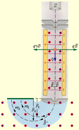 Между полюсами сильного электромагнита помещается вакуумная камера, в которой находятся два электрода в виде полых металлических полуцилиндров (дуантов). К дуантам приложено переменное электрическое напряжение, частота которого равна циклотронной частоте. Заряженные частицы инжектируются в центре вакуумной камеры. Частицы ускоряются электрическим полем в промежутке между дуантами. Внутри дуантов частицы движутся под действием силы Лоренца по полуокружностям, радиус которых растет по мере увеличения энергии частиц. Каждый раз, когда частица пролетает через зазор между дуантами, она ускоряется электрическим полем. Таким образом, в циклотроне, как и во всех других ускорителях, заряженная частица ускоряется электрическим полем, а удерживается на траектории магнитным полем. Циклотроны позволяют ускорять протоны до энергии порядка 20 МэВ. Однородные магнитные поля используются во многих приборах и, в частности, в масс-спектрометрах – устройствах, с помощью которых можно измерять массы заряженных частиц – ионов или ядер различных атомов. Масс-спектрометры используются для разделения изотопов, то есть ядер атомов с одинаковым зарядом, но разными массами (например, 20Ne и 22Ne). Простейший масс-спектрометр показан на рис. 1.18.4. Ионы, вылетающие из источника S, проходят через несколько небольших отверстий, формирующих узкий пучок. Затем они попадают в селектор скоростей, в котором частицы движутся в скрещенных однородных электрическом и магнитном полях. Электрическое поле создается между пластинами плоского конденсатора, магнитное поле – в зазоре между полюсами электромагнита. Начальная скорость На частицу, движущуюся в скрещенных электрическом и магнитном полях, действуют электрическая сила Далее частицы с одним и тем же значением скорости попадают в камеру масс-спектрометра, в которой создано однородное магнитное поле Современные масс-спектрометры позволяют измерять массы заряженных частиц с точностью выше 10–4.