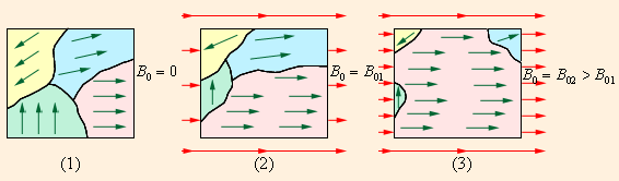 Из рис. 1.19.3 видно, что при Если теперь уменьшать магнитную индукцию B 0 внешнего поля и довести ее вновь до нулевого значения, то ферромагнетик сохранит остаточную намагниченность – поле внутри образца будет равно B r. Остаточная намагниченность образцов позволяет создавать постоянные магниты. Для того, чтобы полностью размагнитить образец, необходимо, изменив знак внешнего поля, довести магнитную индукцию B 0 до значения – B 0c, которое принято называть коэрцитивной силой. Далее процесс перемагничивания может быть продолжен, как это указано стрелками на рис. 1.19.3. У магнито-мягких материалов значения коэрцитивной силы B 0c невелико – петля гистерезиса таких материалов достаточно узкая. Материалы с большим значением коэрцитивной силы, то есть имеющие широкую петлю гистерезиса, относятся к магнито-жестким. Природа ферромагнетизма может быть до конца понята только на основе квантовых представлений. Качественно ферромагнетизм объясняется наличием собственных (спиновых) магнитных полей у электронов. В кристаллах ферромагнитных материалов возникают условия, при которых, вследствие сильного взаимодействия спиновых магнитных полей соседних электронов, энергетически выгодной становится их параллельная ориентация. В результате такого взаимодействия внутри кристалла ферромагнетика возникают самопроизвольно намагниченные области размером порядка 10–2–10–4 см. Эти области называются доменами. Каждый домен представляет из себя небольшой постоянный магнит. В отсутствие внешнего магнитного поля направления векторов индукции магнитных полей в различных доменах ориентированы в большом кристалле хаотически. Такой кристалл в среднем оказывается ненамагниченным. При наложении внешнего магнитного поля