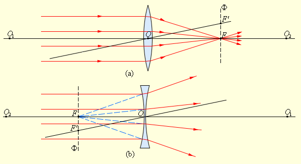 Прямая, проходящая через центры кривизны O 1 и O 2 сферических поверхностей, называется главной оптической осью линзы. В случае тонких линз приближенно можно считать, что главная оптическая ось пересекается с линзой в одной точке, которую принято называть оптическим центром линзы O. Луч света проходит через оптический центр линзы, не отклоняясь от первоначального направления. Все прямые, проходящие через оптический центр, называются побочными оптическими осями. Если на линзу направить пучок лучей, параллельных главной оптической оси, то после прохождения через линзу лучи (или их продолжения) соберутся в одной точке F, которая называется главным фокусом линзы. У тонкой линзы имеются два главных фокуса, расположенных симметрично на главной оптической оси относительно линзы. У собирающих линз фокусы действительные, у рассеивающих – мнимые. Пучки лучей, параллельных одной из побочных оптических осей, после прохождения через линзу также фокусируются в точку F', которая расположена при пересечении побочной оси с фокальной плоскостью Ф, то есть плоскостью, перпендикулярной главной оптической оси и проходящей через главный фокус (рис. 3.3.2). Расстояние между оптическим центром линзы O и главным фокусом F называется фокусным расстоянием. Оно обозначаетcя той же буквой F.