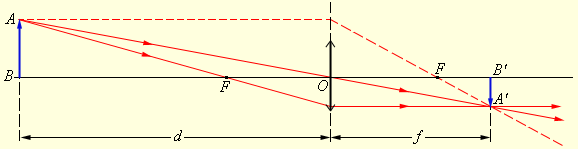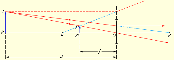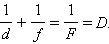 Следует обратить внимание на то, что некоторые из стандартных лучей, использованных на рис. 3.3.3 и 3.3.4 для построения изображений, не проходят через линзу. Эти лучи реально не участвуют в образовании изображения, но они могут быть использованы для построений. Положение изображения и его характер (действительное или мнимое) можно также рассчитать с помощью формулы тонкой линзы. Если расстояние от предмета до линзы обозначить через d, а расстояние от линзы до изображения через f, то формулу тонкой линзы можно записать в виде:
