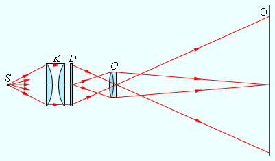 Проекционный аппарат предназначен для получения крупномасштабных изображений. Объектив O проектора фокусирует изображение плоского предмета (диапозитив D) на удаленном экране Э (рис. 3.3.6). Система линз K, называемая конденсором, предназначена для того, чтобы сконцентрировать свет источника S на диапозитиве. На экране Э создается действительное увеличенное перевернутое изображение. Увеличение проекционного аппарата можно менять, приближая или удаляя экран Э с одновременным изменением расстояния между диапозитивом D и объективом O.