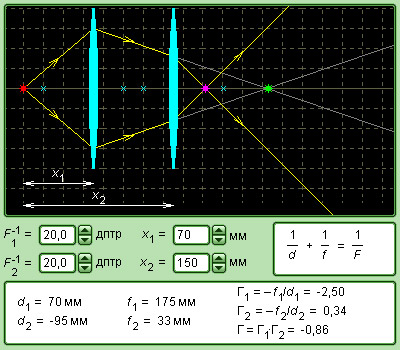 Радиус кривизны выпуклой поверхности считается положительным, вогнутой – отрицательным. Эта формула используется при изготовлении линз с заданной оптической силой. Во многих оптических приборах свет последовательно проходит через две или несколько линз. Изображение предмета, даваемое первой линзой, служит предметом (действительным или мнимым) для второй линзы, которая строит второе изображение предмета. Это второе изображение также может быть действительным или мнимым. Расчет оптической системы из двух тонких линз сводится к двукратному применению формулы линзы, при этом расстояние d 2 от первого изображения до второй линзы следует положить равным величине l – f 1, где l – расстояние между линзами. Рассчитанная по формуле линзы величина f 2 определяет положение второго изображения и его характер (f 2 > 0 – действительное изображение, f 2 < 0 – мнимое). Общее линейное увеличение Γ системы из двух линз равно произведению линейных увеличений обеих линз: Γ = Γ1 · Γ2. Если предмет или его изображение находятся в бесконечности, то линейное увеличение утрачивает смысл. Частным случаем является телескопический ход лучей в системе из двух линз, когда и предмет, и второе изображение находятся на бесконечно больших расстояниях. Телескопический ход лучей реализуется в зрительных трубах – астрономической трубе Кеплера и земной трубе Галилея (см. § 3.5). Тонкие линзы обладают рядом недостатков, не позволяющих получать высококачественные изображения. Искажения, возникающие при формировании изображения, называются аберрациями. Главные из них – сферическая и хроматическая аберрации. Сферическая аберрация проявляется в том, что в случае широких световых пучков лучи, далекие от оптической оси, пересекают ее не в фокусе. Формула тонкой линзы справедлива только для лучей, близких к оптической оси. Изображение удаленного точечного источника, создаваемое широким пучком лучей, преломленных линзой, оказывается размытым. Хроматическая аберрация возникает вследствие того, что показатель преломления материала линзы зависит от длины волны света λ. Это свойство прозрачных сред называется дисперсией. Фокусное расстояние линзы оказывается различным для света с разными длинами волн, что приводит к размытию изображения при использовании немонохроматического света. В современных оптических приборах применяются не тонкие линзы, а сложные многолинзовые системы, в которых удается приближенно устранить различные аберрации. Формирование собирающей линзой действительного изображения предмета используется во многих оптических приборах, таких как фотоаппарат, проектор и т. д. Фотоаппарат представляет собой замкнутую светонепроницаемую камеру. Изображение фотографируемых предметов создается на фотопленке системой линз, которая называется объективом. Специальный затвор позволяет открывать объектив на время экспозиции. Особенностью работы фотоаппарата является то, что на плоской фотопленке должны получаться достаточно резкими изображения предметов, находящихся на разных расстояниях. В плоскости фотопленки получаются резкими только изображения предметов, находящихся на определенном расстоянии. Наведение на резкость достигается перемещением объектива относительно пленки. Изображения точек, не лежащих в плоскости резкого наведения, получа