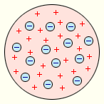 Глава 6. Физика атома и атомного ядра Представление об атомах как неделимых мельчайших частицах вещества возникло еще в античные времена, но только в XVIII веке трудами А. Лавуазье, М. В. Ломоносова и других ученых была доказана реальность существования атомов. Но вопрос об их внутреннем устройстве даже не возникал, и атомы по-прежнему считались неделимыми частицами. В XIX веке изучение атомистического строения вещества существенно продвинулось вперед. В 1833 году при исследовании явления электролиза М. Фарадей установил, что ток в растворе электролита это упорядоченное движение заряженных частиц – ионов. Фарадей определил минимальный заряд иона, который был назван элементарным электрическим зарядом. Его приближенное значение оказалось равным e = 1,60·10–19 Кл. На основании исследований Фарадея можно было сделать вывод о существовании внутри атомов электрических зарядов. Большую роль в развитии атомистической теории сыграл выдающийся русский химикД. И. Менделеев, разработавший в 1869 году периодическую систему элементов, в которой впервые был поставлен вопрос о единой природе атомов. Важным свидетельством сложной структуры атомов явились спектроскопические исследования, которые привели к открытию линейчатых спектров атомов. В начале XIX века были открыты дискретные спектральные линии в излучении атомов водорода в видимой части спектра. Впоследствии, в 1885 г. И. Бальмером были установлены математические закономерности, связывающие длины волн этих линий. В 1896 году А. Беккерель обнаружил явление испускания атомами невидимых проникающих излучений, названное радиоактивностью. В последующие годы явление радиоактивности изучалось многими учеными (М. Склодовская-Кюри, П. Кюри, Э. Резерфорд и др.). Было обнаружено, что атомы радиоактивных веществ испускают три вида излучений различной физической природы (альфа-, бета- и гамма-лучи). Альфа-лучи оказались потоком ионов гелия,бета-лучи – потоком электронов, а гамма-лучи – потоком квантов жесткого рентгеновского излучения. В 1897 году Дж. Томсон открыл электрон и измерил отношение e / m заряда электрона к массе. Опыты Томсона подтвердили вывод о том, что электроны входят в состав атомов. Таким образом, на основании всех известных к началу XX века экспериментальных фактов можно было сделать вывод о том, что атомы вещества имеют сложное внутреннее строение. Они представляют собой электронейтральные системы, причем носителями отрицательного заряда атомов являются легкие электроны, масса которых составляет лишь малую долю массы атомов. Основная часть массы атомов связана с положительным зарядом. Перед наукой встал вопрос о внутреннем строении атомов. Первая попытка создания модели атома на основе накопленных экспериментальных данных (1903 г.) принадлежит Дж. Томсону. Он считал, что атом представляет собой электронейтральную систему шарообразной формы радиусом, примерно равным 10–10 м. Положительный заряд атома равномерно распределен по всему объему шара, а отрицательно заряженные электроны находятся внутри него (рис. 6.1.1). Для объяснения линейчатых спектров испускания атомов Томсон пытался определить расположение электронов в атоме и рассчитать частоты их колебаний около положений равновесия. Однако эти попытки не увенчались успехом. Через несколько лет в опытах великого английского физик