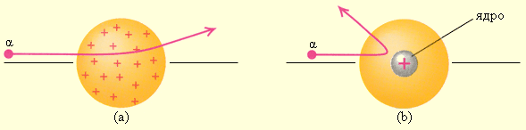 От радиоактивного источника, заключенного в свинцовый контейнер, α-частицы направлялись на тонкую металлическую фольгу. Рассеянные частицы попадали на экран, покрытый слоем кристаллов сульфида цинка, способных светиться под ударами быстрых заряженных частиц. Сцинтилляции (вспышки) на экране наблюдались глазом с помощью микроскопа. Наблюдения рассеянных α-частиц в опыте Резерфорда можно было проводить под различными углами φ к первоначальному направлению пучка. Было обнаружено, что большинство α-частиц проходит через тонкий слой металла, практически не испытывая отклонения. Однако небольшая часть частиц отклоняется на значительные углы, превышающие 30°. Очень редкие α-частицы (приблизительно одна на десять тысяч) испытывали отклонение на углы, близкие к 180°. Этот результат был совершенно неожиданным даже для Резерфорда. Его представления находилbcm в резком противоречии с моделью атома Томсона, согласно которой положительный заряд распределен по всему объему атома. При таком распределении положительный заряд не может создать сильное электрическое поле, способное отбросить α-частицы назад. Электрическое поле однородного заряженного шара максимально на его поверхности и убывает до нуля по мере приближения к центру шара. Если бы радиус шара, в котором сосредоточен весь положительный заряд атома, уменьшился в n раз, то максимальная сила отталкивания, действующая на α-частицу, по закону Кулона возросла бы в n 2 раз. Следовательно, при достаточно большом значении n α-частицы могли бы испытать рассеяние на большие углы вплоть до 180°. Эти соображения привели Резерфорда к выводу, что атом почти пустой, и весь его положительный заряд сосредоточен в малом объеме. Эту часть атома Резерфорд назвал атомным ядром. Так возникла ядерная модель атома. Рис. 6.1.3 иллюстрирует рассеяние α-частицы в атоме Томсона и в атоме Резерфорда.