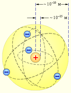 Таким образом, опыты Резерфорда и его сотрудников привели к выводу, что в центре атома находится плотное положительно заряженное ядро, диаметр которого не превышает 10–14–10–15 м. Это ядро занимает только 10–12 часть полного объема атома, но содержит весь положительный заряд и не менее 99,95 % его массы. Веществу, составляющему ядро атома, следовало приписать колоссальную плотность порядка ρ ≈ 1015 г/см3. Заряд ядра должен быть равен суммарному заряду всех электронов, входящих в состав атома. Впоследствии удалось установить, что если заряд электрона принять за единицу, то заряд ядра в точности равен номеру данного элемента в таблице Менделеева. Радикальные выводы о строении атома, следовавшие из опытов Резерфорда, заставляли многих ученых сомневаться в их справедливости. Не был исключением и сам Резерфорд, опубликовавший результаты своих исследований только в 1911 г. через два года после выполнения первых экспериментов. Опираясь на классические представления о движении микрочастиц, Резерфорд предложил планетарную модель атома. Согласно этой модели, в центре атома располагается положительно заряженное ядро, в котором сосредоточена почти вся масса атома. Атом в целом нейтрален. Вокруг ядра, подобно планетам, под действием кулоновских сил со стороны ядра вращаются электроны (рис. 6.1.4). Находиться в состоянии покоя электроны не могут, так как они упали бы на ядро.