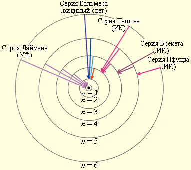который очень хорошо согласуется с эмпирическим значением R. Рис. 6.3.1 иллюстрирует образование спектральных серий в излучении атома водорода при переходе электрона с высоких стационарных орбит на более низкие.
