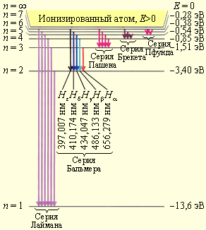 На рис. 6.3.2. изображена диаграмма энергетических уровней атома водорода и указаны переходы, соответствующие различным спектральным сериям.