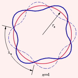 Прекрасное согласие боровской теории атома водорода с экспериментом служило веским аргументом в пользу ее справедливости. Однако попытки применить эту теорию к более сложным атомам не увенчались успехом. Бор не смог дать физическую интерпретацию правилу квантования. Это было сделано десятилетием позже де Бройлем на основе представлений о волновых свойствах частиц. Де Бройль предложил, что каждая орбита в атоме водорода соответствует волне, распространяющейся по окружности около ядра атома. Стационарная орбита возникает в том случае, когда волна непрерывно повторяет себя после каждого оборота вокруг ядра. Другими словами, стационарная орбита соответствует круговой стоячей волне де Бройля на длине орбиты (рис. 6.3.3). Это явление очень похоже на стационарную картину стоячих волн в струне с закрепленными концами.