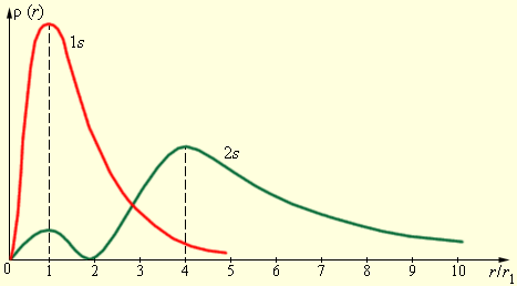 Как видно из рис. 6.3.4, электрон в состоянии 1 s (основное состояние атома водорода) может быть обнаружен на различных расстояниях от ядра. С наибольшей вероятностью его можно обнаружить на расстоянии, равном радиусу r 1 первой боровской орбиты. Вероятность обнаружения электрона в состоянии 2 s максимальна на расстоянии r = 4 r 1 от ядра. В обоих случаях атом водорода можно представить в виде сферически симметричного электронного облака, в центре которого находится ядро.