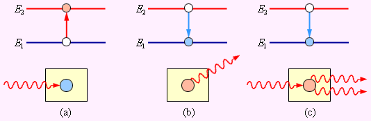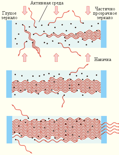 Рассмотрим слой прозрачного вещества, атомы которого могут находиться в состояниях с энергиями E 1 и E 2 > E 1. Пусть в этом слое распространяется излучение резонансной частоты перехода ν = Δ E / h. Согласно распределению Больцмана, при термодинамическом равновесии большее количество атомов вещества будет находиться в нижнем энергетическом состоянии. Некоторая часть атомов будет находиться и в верхнем энергетическом состоянии, получая необходимую энергию при столкновениях с другими атомами. Обозначим населенности нижнего и верхнего уровней соответственно через n 1 и n 2 < n 1. При распространении резонансного излучения в такой среде будут происходить все три процесса, изображенные на рис. 6.4.1. Эйнштейн показал, что процесс (a) поглощения фотона невозбужденным атомом и процесс (c) индуцированного испускания кванта возбужденным атомом имеют одинаковые вероятности. Так как n 2 < n 1 поглощение фотонов будет происходить чаще, чем индуцированное испускание. В результате прошедшее через слой вещества излучение будет ослабляться. Это напоминает появление темных фраунгоферовских линий в спектре солнечного излучения. Излучение, возникающее в результате спонтанных переходов, некогерентно, распространяется во всевозможных направлениях и не дает вклада в проходящую волну. Чтобы проходящая через слой вещества волна усиливалась, нужно искусственно создать условия, при которых n 2 > n 1, т. е. создать инверсную населенность уровней. Такая среда является термодинамически неравновесной. Идея использования неравновесных сред для получения оптического усиления впервые была высказана В. А. Фабрикантом в 1940 году. В 1954 году русские физики Н. Г. Басов и А. М. Прохоров и независимо от них американский ученый Ч. Таунс использовали явление индуцированного испускания для создания микроволнового генератора радиоволн с длиной волны λ = 1,27 см. За разработку нового принципа усиления и генерации радиоволн в 1964 году все трое были удостоены Нобелевской премии. Среда, в которой создана инверсная населенность уровней, называется активной. Она может служить резонансным усилителем светового сигнала. Для того, чтобы возникала генерация света, необходимо использовать обратную связь. Для этого активную среду нужно расположить между двумя высококачественными зеркалами, отражающими свет строго назад так, чтобы он многократно прошел через активную среду, вызывая лавинообразный процесс индуцированной эмиссии когерентных фотонов. При этом в среде должна поддерживаться инверсная населенность уровней. Этот процесс в лазерной физике принято называть накачкой. Начало лавинообразному процессу в такой системе при определенных условиях может положить случайный спонтанный акт, при котором возникает излучение, направленное вдоль оси системы. Через некоторое время в такой системе возникает стационарный режим генерации. Это и есть лазер. Лазерное излучение выводится наружу через одно (или оба) из зеркал, обладающее частичной прозрачностью. На рис. 6.4.2 схематически представлено развитие лавинообразного процесса в лазере.