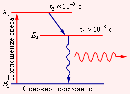 Существуют различные способы получения среды с инверсной населенностью уровней. В рубиновом лазере используется оптическая накачка, атомы возбуждаются за счет поглощения света. Но для этого недостаточно только двух уровней. Каким бы мощным не был свет лампы–накачки, число возбужденных атомов не будет больше числа невозбужденных. В рубиновом лазере накачка производится через выше расположенный третий уровень (рис. 6.4.3).