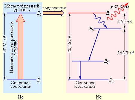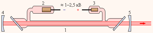 Накачка лазерного перехода E 4 → E 3 в неоне осуществляется следующим образом. В высоковольтном электрическом разряде вследствие соударений с электронами значительная часть атомов гелия переходит в верхнее метастабильное состояния E 2. Возбужденные атомы гелия неупруго сталкиваются с атомами неона, находящимися в основном состоянии, и передают им свою энергию. Уровень E 4 неона расположен на 0,05 эВ выше метастабильного уровня E 2 гелия. Недостаток энергии компенсируется за счет кинетической энергии соударяющихся атомов. На уровне E 4 неона возникает инверсная населенность по отношению к уровню E 3, который сильно обедняется за счет спонтанных переходов на ниже расположенные уровни. При достаточно высоком уровне накачки в смеси гелия и неона начинается лавинообразный процесс размножения идентичных когерентных фотонов. Если кювета со смесью газов помещена между высокоотражающими зеркалами, то возникает лазерная генерация. На рис. 6.4.5 изображена схема гелий-неонового лазера.