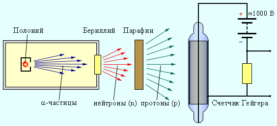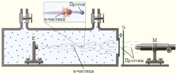 Прибор Резерфорда состоял из вакуумированной камеры, в которой был расположен контейнер К с источником α-частиц. Окно камеры было закрыто металлической фольгой Ф, толщина которой была подобрана так, чтобы α-частицы не могли через нее проникнуть. За окном располагался экран Э, покрытый сернистым цинком. С помощью микроскопа М можно было наблюдать сцинтилляции (т. е. световые вспышки) в точках попадания на экран тяжелых заряженных частиц. При заполнении камеры азотом низкого давления на экране возникали световые вспышки, указывающие на появление потока каких-то частиц, способных проникать через фольгу Ф, практически полностью задерживающую поток α-частиц. Отодвигая экран Э от окна камеры, Резерфорд измерил среднюю длину свободного пробега наблюдаемых частиц в воздухе. Она оказалась приблизительно равной 28 см, что совпадало с оценкой длины пробега H-частиц, наблюдавшихся ранее Дж. Томсоном. Исследования действия на частицы, выбиваемые из ядер азота, электрических и магнитных полей показали, что эти частицы обладают положительным элементарным зарядом и их масса равна массе ядра атома водорода. Впоследствии опыт был выполнен с целым рядом других газообразных веществ. Во всех случаях было обнаружено, что из ядер этих веществ α-частицы выбивают H-частицы или протоны. По современным измерениям, положительный заряд протона в точности равен элементарному заряду e = 1,60217733·10–19 Кл, то есть равен по модулю отрицательному заряду электрона. В настоящее время равенство зарядов протона и электрона проверено с точностью 10–22. Такое совпадение зарядов двух непохожих друг на друга частиц вызывает удивление и остается одной из фундаментальных загадок современной физики. Масса протона, по современным измерениям, равна m p = 1,67262∙10–27 кг. В ядерной физике массу частицы часто выражают в атомных единицах массы (а. е. м.), равной