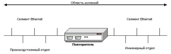 Існуючі обмеження топологій, а саме обмеження довжини кабельного сегменту можна обійти, використовуючи різноманітні пристрої, так звані активні комунікаційні пристрої, оскільки є ще й пасивні комунікаційні пристрої. До них відносять кабелі та інші середовища передачі даних. Повт По суті справи, повторювачі просто забезпечують можливість збільшення протяжності фізичного середовища, не впливаючи на якість передачі. Проте простота з'єднання мереж за допомогою репітерів не дістається дарма - після такого об'єднання зростає завантаженість обох сегментів. Повторювач просто передає всі одержані з одного сегменту пакети в інший сегмент, внаслідок чого збільшується розмір колізійного домену і вірогідність виникнення конфліктів при спробі доступу до середовища передачі. В приведеному на малюнку прикладі співробітники інженерного відділу можуть обмінюватися даними з користувачами з виробничого відділу і спільно використовувати пристрої і ресурси комп'ютерів, що розділяються в кожній мережі. Проте за цю можливість доведеться заплатити збільшенням завантаження середовища в обох мережах - пакети передаватимуться в обидві мережі незалежно від того, адресовані вони вузлу в своєму або сусідньому сегменті. До установки повторювача в кожній мережі був присутній тільки локальний трафік, тепер же передаються пакети з обох сегментів. Локальний трафік однієї мережі в результаті відніматиме частину смуги іншої мережі, знижуючи загальну продуктивність. По суті справи сполучені повторювачем мережі є однією локальною мережею (колізійним доменом). В даний час повторювачі (в своєму початковому варіанті - для з'єднання ЛОМ) використовуються достатньо рідко, проте слід пям'ятати, що концентраторы 10BaseT, 100BaseTX є нічим іншим, як багатопортовими повторювачами і до них застосовні всі сказані вище слова. Обмеження на використовування повторювачів в мережах Ethernet описані правилом чотирьох концентраторів. Таким чином виникає нове обмеження в мережі, яке пов’язане із зростанням домену колізій. Частина мережі, в якій комп’ютери взаємодіють між собою, в наслідок чого можуть виникати колізії називається доменом колізій. Для зменшення домену колізій використовують сегментацію мереж, т.т. їх розподіл на менші частини. Межею сегментації є мікро сегментація. Для виконання сегментації мережі використовуються мости та комутатори.