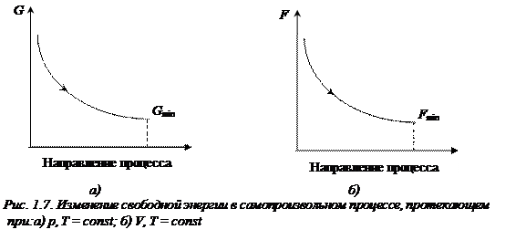 Неравенства (1.24), (1.25) являются условием самопроизвольного протекания процесса при постоянстве соответствующих параметров: самопроизвольно могут протекать только те процессы, которые приводят к понижению свободной энергии системы; система приходит в состояние равновесия, когда свободная энергия достигает минимального значения (рис. 1.7.).