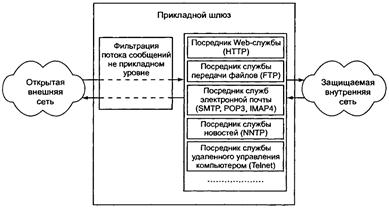 Прикладной шлюз, называемый также экранирующим шлюзом, функционирует на прикладном уровне модели OSI, охватывая также уровень представления, и обеспечивает наиболее надежную защиту межсетевых взаимодействий. Защитные функции прикладного шлюза, как и шлюза сеансового уровня, относятся к функциям посредничества. Однако прикладной шлюз, в отличие от шлюза сеансового уровня, может выполнять существенно большее количество функций защиты, к которым относятся следующие: - идентификация и аутентификация пользователей при попытке установления соединений через МЭ; - проверка подлинности информации, передаваемой через шлюз; - разграничение доступа к ресурсам внутренней и внешней сетей; - фильтрация и преобразование потока сообщений, например динамический поиск вирусов и прозрачное шифрование информации; - регистрация событий, реагирование на задаваемые события, а также анализ зарегистрированной информации и генерация отчетов; - кэширование данных, запрашиваемых из внешней сети. Поскольку функции прикладного шлюза относятся к функциям посредничества, этот шлюз представляет собой универсальный компьютер, на котором функционируют программныепосредники (экранирующие агенты) — по одному для каждого обслуживаемого прикладного протокола (HTTP, FTP, SMTP, NNTP[1] и др.). Программный посредник (application proxy) каждой службы TCP/IP ориентирован на обработку сообщений и выполнение функций защиты, относящихся именно к этой службе. Прикладной шлюз перехватывает с помощью соответствующих экранирующих агентов входящие и исходящие пакеты, копирует и перенаправляет информацию, т. е. функционирует в качестве сервера-посредника, исключая прямые соединения между внутренней и внешней сетью (рис. 6).