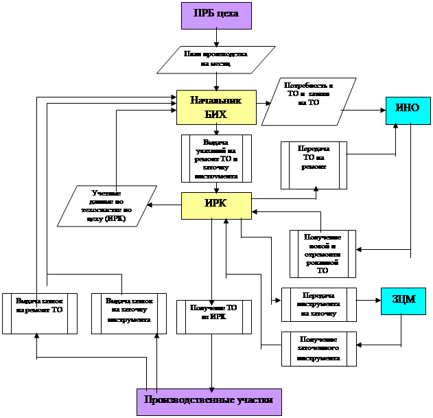 Основная часть запаса техоснастки на предприятии хранится в ЦИС-е. Регулирование складских запасов техоснастки, расходуемой в больших количествах, осуществляется, как правило, по системе “максимум-минимум”. Оборотный фонд техоснастки предприятия складывается из оборотного фонда техоснастки данного вида во всех цехах предприятия, а также страхового и переходящего запаса в ЦИС-е. Основной задачей цехового информационного хозяйства является своевременное обеспечение рабочих мест данного цеха доброкачественной техоснасткой при минимальных размерах оборотного фонда. Эта задача решается в цехе службой БИХ (бюро информационного хозяйства) под руководством заместителя начальника цеха по техническим вопросам. Начальнику БИХ подчиняются все ИРК (инструментально-раздаточные кладовые) цеха. Мнемосхема работы инструментального хозяйства в цехах основного производства представлены на рис. 4.5.