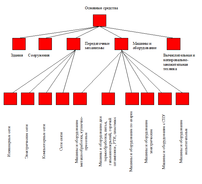 Основные функции ремонтной службы предприятия: 1) паспортизация и аттестация оборудования; 2) разработка техпроцессов ремонта оборудования; 3) планово-предупредительный ремонт оборудования (ППР); 4) модернизация оборудования. Управление ремонтным хозяйством – это управление, с точки зрения процессной модели предприятия, ресурсами предприятия. В данном случае необходимо рассматривать ресурсы – “Основные средства”. Состав ресурсов “Основные средства” представлен на рис. 4.7.