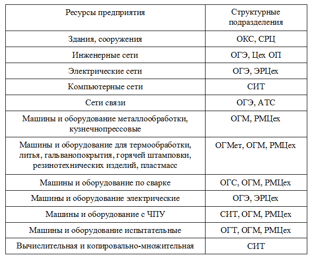 В таблице 4.1. представлено закрепление ресурсов “Основные средства” за структурными подразделениями машиностроительного предприятия. Это закрепление показывает, кто должен заниматься ремонтом основных средств предприятия