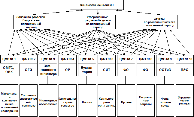 - налоги; - компьютеры и оргтехника; - прочее; - социальные затраты; - фонд оплаты труда; - управленческие расходы. Все эти статьи закреплены за центрами финансовой ответственности, которыми руководят соответствующие руководители предприятия. Руководители ЦФО делают заявки по своим разделам бюджета на планируемый период, а также представляют на финансовую комиссию отчеты по своим разделам бюджета. На финансовой комиссии консолидировано принимаются (утверждаются) все статьи бюджета предприятия.