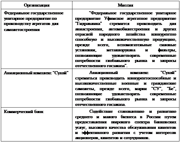 При формулировании миссии необходимо ясно обозначить область деятельности предприятия и определить потребителя продукции. Таким образом, формулировка миссии должна отражать стратегию и тактику деятельности предприятия. Примеры определения миссии различных организаций приведены в табл. 5.2.