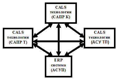 5.2. Создание концепции интегрированной АСУ Целью концепции является определение основных принципов создания, развития и функционирования интегрированной АСУ (ИАСУ) предприятия. Задачей концепции является определение для разработчиков ИАСУ основных принципов ее построения, функционирования и развития. В условиях новых экономических отношений основной функцией предприятия является выпуск продукции (оказание услуг) с целью получения положительных экономических результатов от реализации этой продукции. Конечный успех предприятия зависит во многом от наличия и эффективного использования информационных технологий. Современные промышленные предприятия, как правило, используют CALS технологии, которые позволяют автоматизировать проектирование новых изделий, технологической оснастки, технологических процессов, выдавать программы для станков с ЧПУ и организовывать автоматизированный учет выпускаемых деталей в системе АСУ ТП на основании полученных планов из ERP системы. Все это предполагает создание интегрированной АСУ, включающей в себя ERP систему и CALS технологии, которые должны быть информационно увязаны между собой. На рис. 6.5 представлена укрупненная схема информационной взаимоувязки в интегрированной автоматизированной системе управления предприятием.