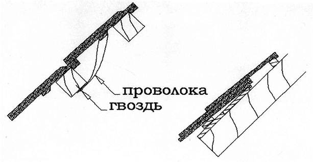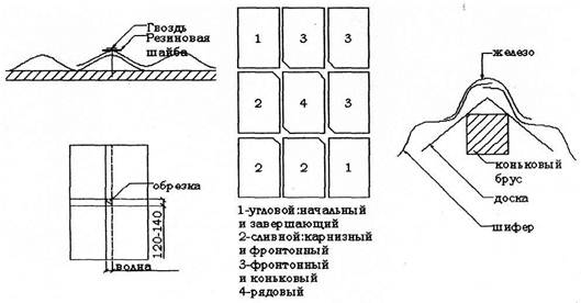 Кровля из асбоцементных и стеклопластиковых волнистых листов. Применяют асбоцементные волнистые листы различных профилей – обыкновенного (ВО) (укладываемой по доскам обрешетки 60х60 через 50 мм) размером 678х1200 мм так, чтобы каждый лист опирался на 3 бруска. Уклон >270; – усиленного и унифицированного профилей (ВУ, УВ) (укладывается по доскам обрешетка закрепляемых на железобетонных плитах или железобетонных прогонах с крюками). Размер 994х17502800. Уклон 250. Листы укладываются начиная с карниза справа налево. Поперечная нахлестка равна одной волне.