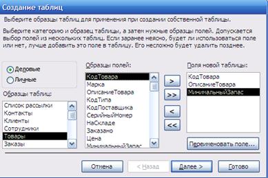 Дозволяє створити таблицю, використовуючи зразки таблиць, що поставляються разом з Access. Створення таблиці поділене на кроки. На кожному кроці майстра проводяться різні налаштування для майбутньої таблиці. Перехід до наступного кроку здійснюється натисненням кнопки Далі. На першому кроці необхідно вибрати зразок таблиці і полів. Зразки таблиць діляться на ділове застосування і особисте застосування. Вікно для вибору потрібного зразка і полів з цього зразка виглядає, як показано на рисуку 5.4.7. Для вибору потрібного поля використовуються кнопки:
