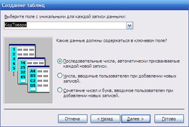 Рис. 5.4.8 Майстер таблиць. Вікно для вибору способу визначення ключа. Якщо ви вибрали самостійне визначення ключового поля, то на наступному кроці, необхідно вибрати поле, яке буде ключовим, і які дані міститимуться в ключовому полі: