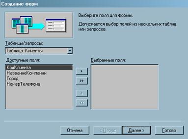 Етапи роботи Майстра: Шаг 1. полягає у виборі полів таблиць, дані, для заповнення яких можна буде вводити в створюваній формі. Виконується це виділенням відповідного пункту в списку Доступні поля і натисненням на одну з двох кнопок переміщення (одинарний значок переносить виділене поле, а подвійний - відразу всі доступні поля). При цьому назва поля переходить в список Вибрані поля і це означає, що воно буде доступне для заповнення на створюваній формі. Якщо помилково було додано непотрібне поле, то його можна перемістити назад, виконавши аналогічні маніпуляції в списку вибраних полів і скориставшись кнопками із значками направленими в протилежному напрямі.