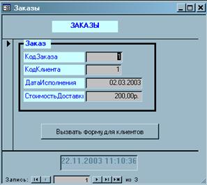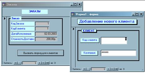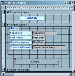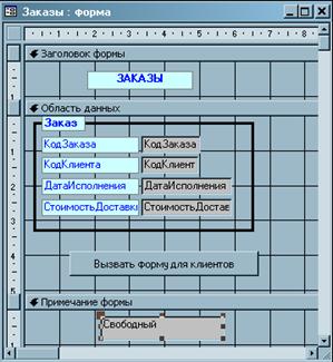 Рис. 5.7.10 Виклик однієї форми з іншої. Відкрийте форму Замовлення в режимі конструктора. При необхідності збільште область примітки форми. Додайте в цю область елемент Поле. У написі зітріть весь текст і новий не вводите. Зробіть активним елемент з ім'ям Вільний (тобто необхідно клацнути на нім мишкою). По правій клавіші миші викличте його контекстне меню і в нім виберіть пункт Властивості.