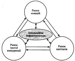 Процес переводу новації в нововведення вимагає витрат різних ресурсів, основними з яких є інвестиції і час. Новації формують ринок новацій, інвестиції - ринок капіталу, інновації - ринок чистої конкуренції нововведень, як показано на рис. 2.2.