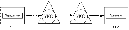 В УКСе: a) Сообщение запоминается b) Анализируется адрес и направление передачи c) Находятся свободные каналы этого направления от УКС-1 и передается информация в УКС-2 d) В УКС-2 происходит аналогичная операция e) В итоге сообщение попадает в ОП2. При коммутации каналов: оператор набирает номер адресата, осуществляется поэтапная коммутация каналов, осуществляется само сообщение. Недостаток: Если хотя бы на одном из УК не нашлось свободного канала, то оператору приходится набирать вновь. Система уходит в «отбой», поэтому доставка может оказаться достаточно долгой, чем в системе УКС.