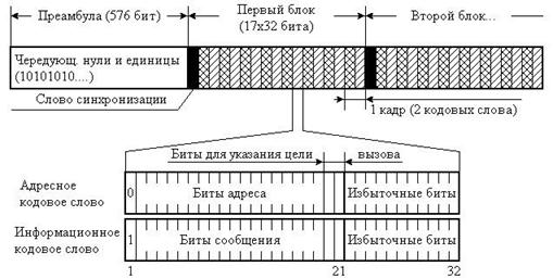 Каждому пейджеру программируется заданное временное окно. Время передачи 1 бита при скорости передачи 1200 бит/с с сообщением из 40 символов=0,83 *10^-3 (с) Время передачи одного кодового слова = 26,5 * 10^-3 (с) Всего цикла = 426*10^-3 (с) Статистически установлено, что в ЧНН интенсивность вызовов, приходящаяся на одного абонента, составляет 0,2 вызова в час. Расчёты показывают, что при рассчитанных выше параметрах, на 1 канале обслуживается 18000 абонентов. Получается фантастическое использование полосы частот радиоканалов. Для полосы 25 кГц на каждый Гц условно приходится меньше 1 абонента. Сигнал в формате POCSAG начинается с преамбулы, состоящей из 576 бит чередующихся 0 и 1. Преамбула служит для вывода приемного устройства (пейджера) из "спящего" состояния в режим "приема" и его тактовой синхронизации. После преамбулы следует поток блоков, содержащих физические адреса пейджеров и тексты сообщений. Длина кодовой последовательности в формате POCSAG не определена, блоки следуют один за другим каждый со своим кодовым словом синхронизации - для подстройки синхронизации приемников (при передаче длинных сообщений). Каждый блок состоит из 17-ти 32-битных слов. Первое из них является словом синхронизации (фиксированная последовательность 32 бит), далее идет последовательность из восьми двойных слов или кадров (фреймов), нумеруемых с нулевого по 7-й. Каждое 32-разрядное слово содержит 21 информационный бит и 11 избыточных (контрольных) бит, которые служат для определения и корректировки ошибок. Протокол предусматривает коррекцию ошибок по алгоритму Бокгауза-Чоудхудри-Хэквингема, сокращенно БЧХ(32,12), при котором в одном 32-битном кодовом слове корректируется ошибка при приеме одного неверного бита (либо 2, если расстояние между ними не превышает 6 бит), а возникновение от 2 до 5 ошибок детектируется (т.е. это слово исключается и в большинстве моделей текстовых пейджеров эта часть обозначается скобками). В зависимости от функционального назначения блоки делятся на адресные, в которых передается физический адрес пейджера и информационные, содержащие текст сообщения.